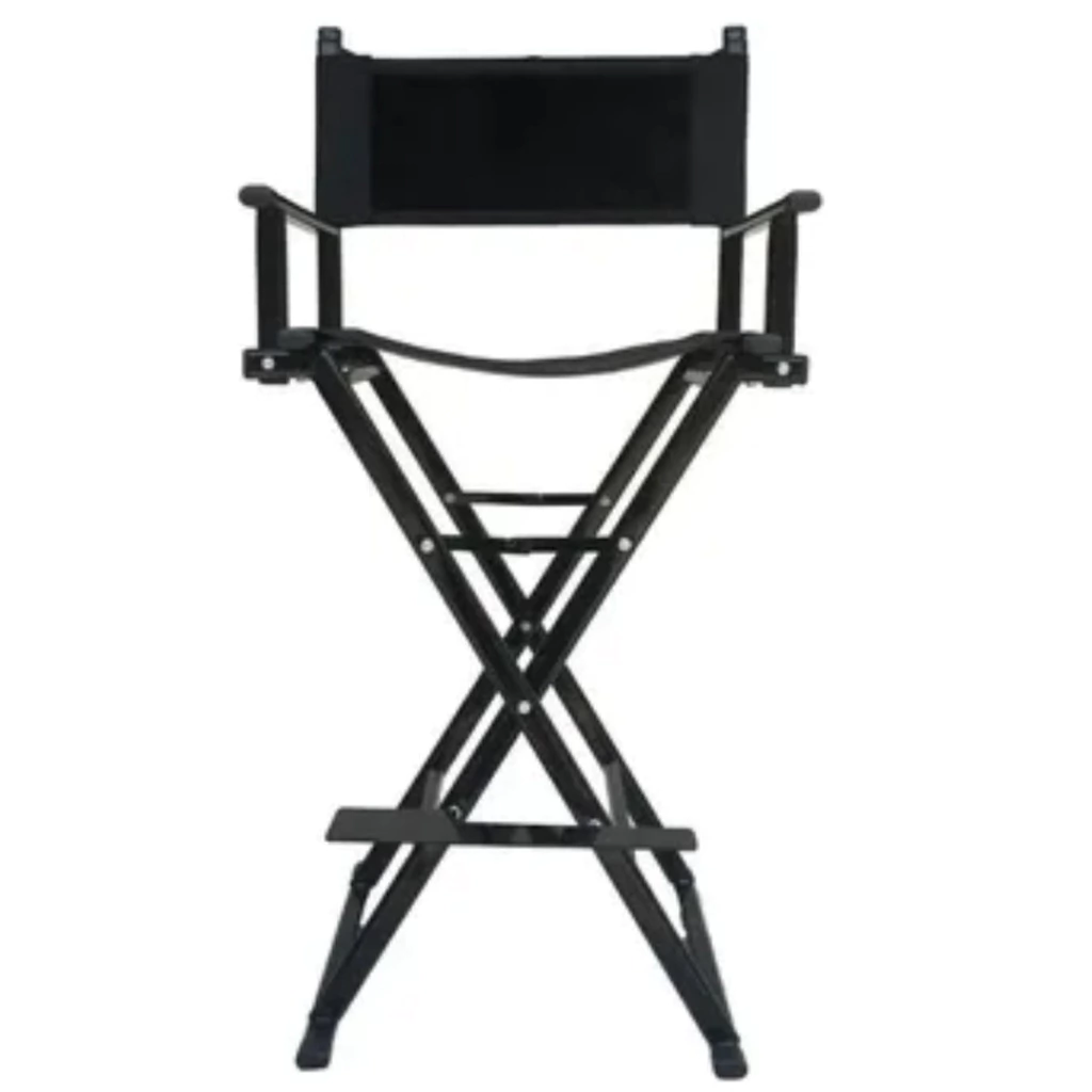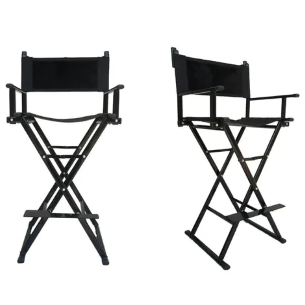 Esta cadeira do diretor de maquiador profissional feito de alumínio resistente em um acabamento em preto com heavy-duty hardware. Esta é uma cadeira ideal para maquiagem beleza artistas e diretores de imagem em movimento, atores, ou pessoal. É dobrável, tornando-o flexível e fácil para o transporte e a única assembleia necessário é o descanso para os pés de madeira.